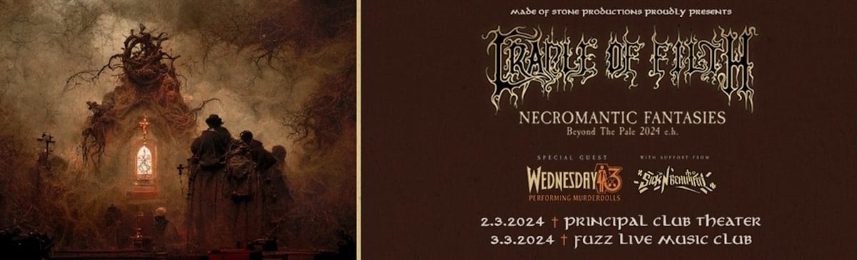 Οι θρυλικοί Cradle of Filth επιστρέφουν στην Ελλάδα για δύο μοναδικές συναυλίες, μία στη Θεσσαλονίκη και μία στην Αθήνα, στις 2 και 3 Μαρτίου 2024 αντίστοιχα. Η συναυλία στη Θεσσαλονίκη θα πραγματοποιηθεί στο Principal Club Theater, ενώ η συναυλία στην Αθήνα θα λάβει χώρα στο Fuzz Live Music Club. Μαζί τους θα εμφανιστούν οι Wednesday 13 και Sick N Beautiful, προσφέροντας ένα εκρηκτικό πρόγραμμα γεμάτο από ακραίο metal. Οι Cradle of Filth, γνωστοί για τη σκοτεινή και θεατρική τους προσέγγιση στη μουσική, έχουν δημιουργήσει μια μοναδική καριέρα από το 1991 και συνεχίζουν να εντυπωσιάζουν το κοινό τους με την καλλιτεχνική τους εξέλιξη. Αυτές οι συναυλίες αναμένονται με ανυπομονησία από τους Έλληνες fans, καθώς οι Cradle of Filth έχουν αφήσει ανεξίτηλη σφραγίδα στη metal σκηνή. Η προσέλευση είναι προγραμματισμένη για τις 19:00, με την έναρξη των συναυλιών να είναι στις 19:15. Μην χάσετε την ευκαιρία να ζήσετε μια από τις πιο σκοτεινές νύχτες της ερχόμενης άνοιξης!